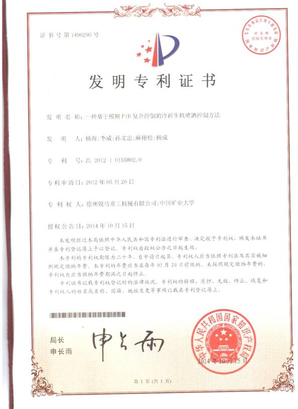 新获国家批准的专利名称为:一种基于模湖PID复合控制的冷再生机喷洒控制方法,该发明专利由我公司与中国矿业大学联合开发,专利权由双方共有。该项专利早已在我公司生产的路面冷再生机上获得应用。路面冷再生机的添加剂喷洒控制系统的精确与稳定对冷再生施工质量有着决定性的影响,对于有经验的路面冷再生行业人士来说是深有体会。我公司冷再生机喷水系统具有计量准确,流量稳定的特点,深受广大用户的好评,这是我公司坚持走技术创新,掌握了核心技术的结果。得益于持续不断的技术创新,我公司冷再生机产品在技术水平上已处于国内领先地位,产品销量也迭创新高,同样国内领先。坚持技术创新,保持产品性能优势是徐州锐马重工一贯的宗旨,与进口机械一争高下,促进国内路面冷再生事业的健康发展是徐州锐马重工不变的目标。
